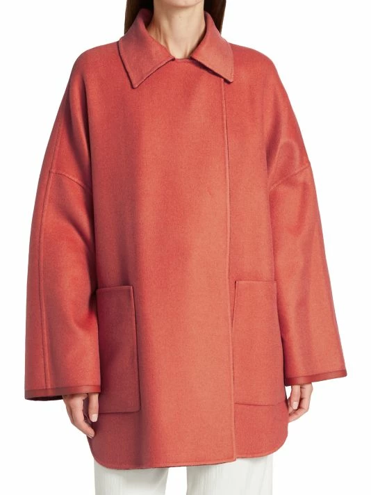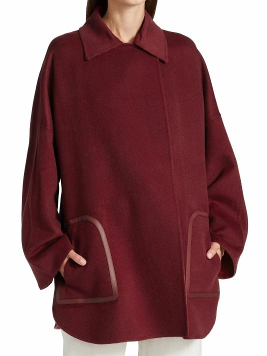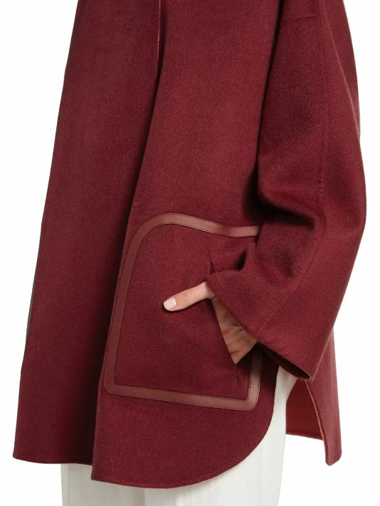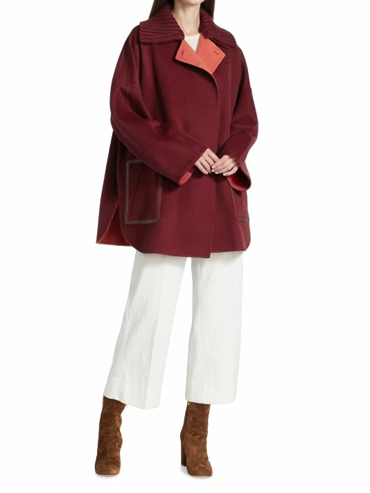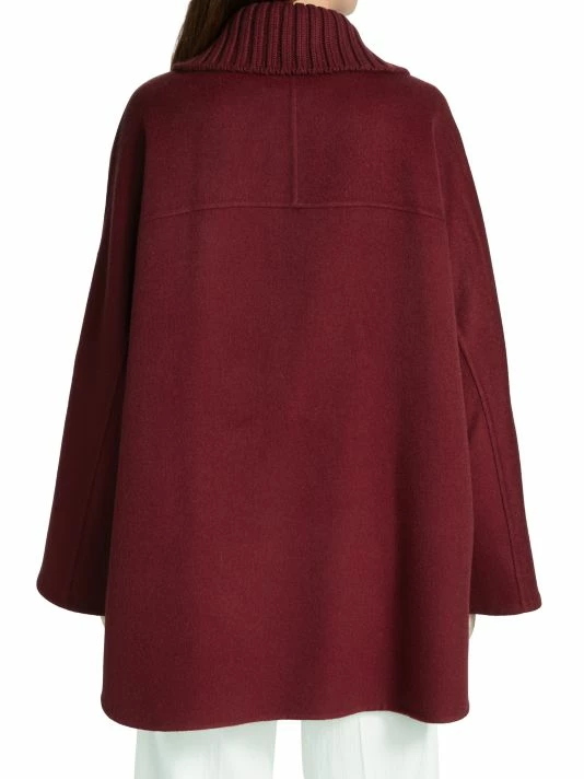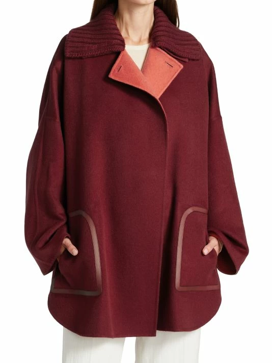 Reversible cape crafted of double-faced cashmere, featuring a ribbed detachable collar, completed with a single-button collar.