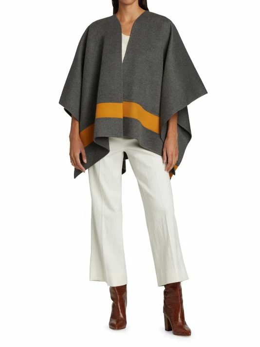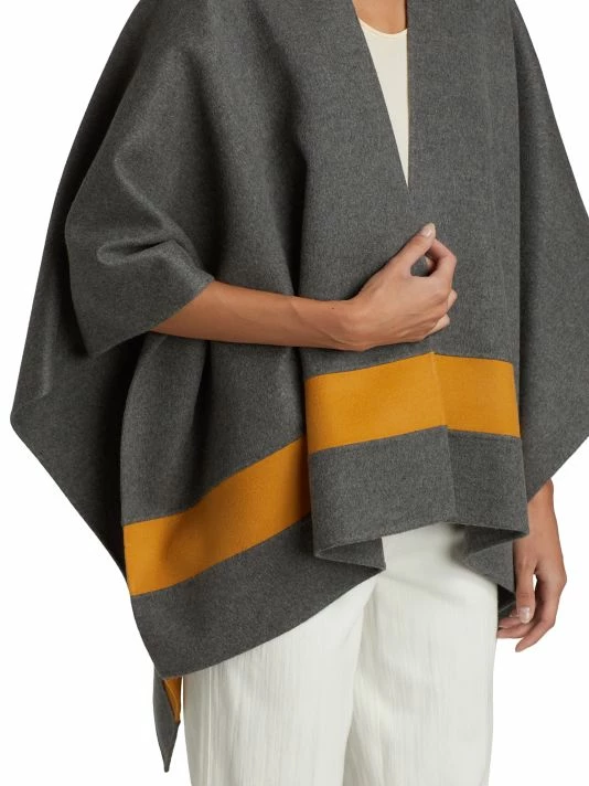Embellished with a contrast band at the base, this cashmere cape boasts timeless elegance.