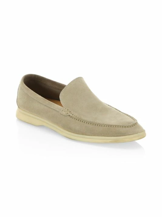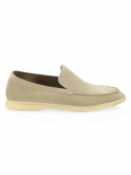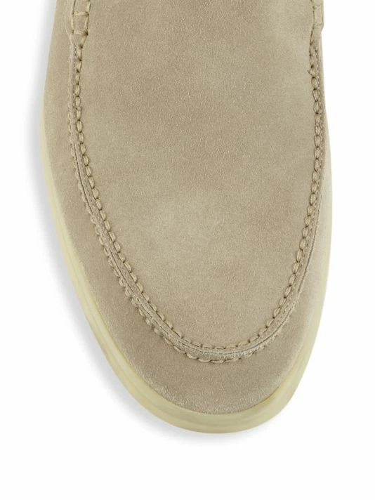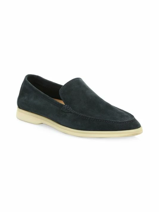 - Hand stitched smooth suede slip-ons with exposed stitching at toe